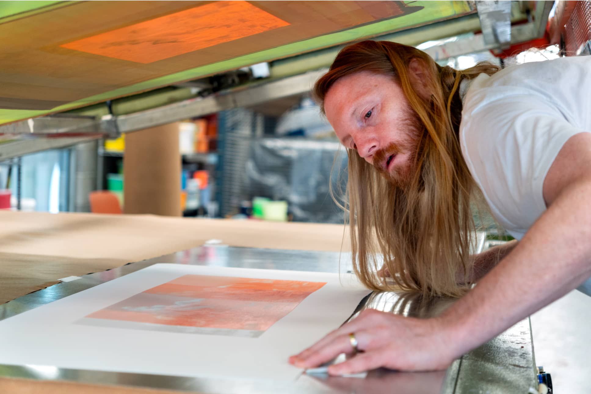 Seven-color water-based screenprint, UV ink on Coventry Rag 335