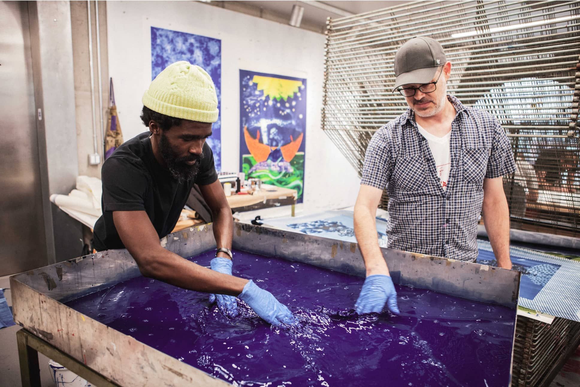 In his work on this edition created at the PHA Printshop, Forde expanded upon his decade-long experimentation in cyanotype by adding layers of silkscreen and batik dye. Fall Of Man is a statement on perception and ways of seeing, emphasizing the contrast between tonal and graphic modes of representation, the poetic imaginary, and lived experience.