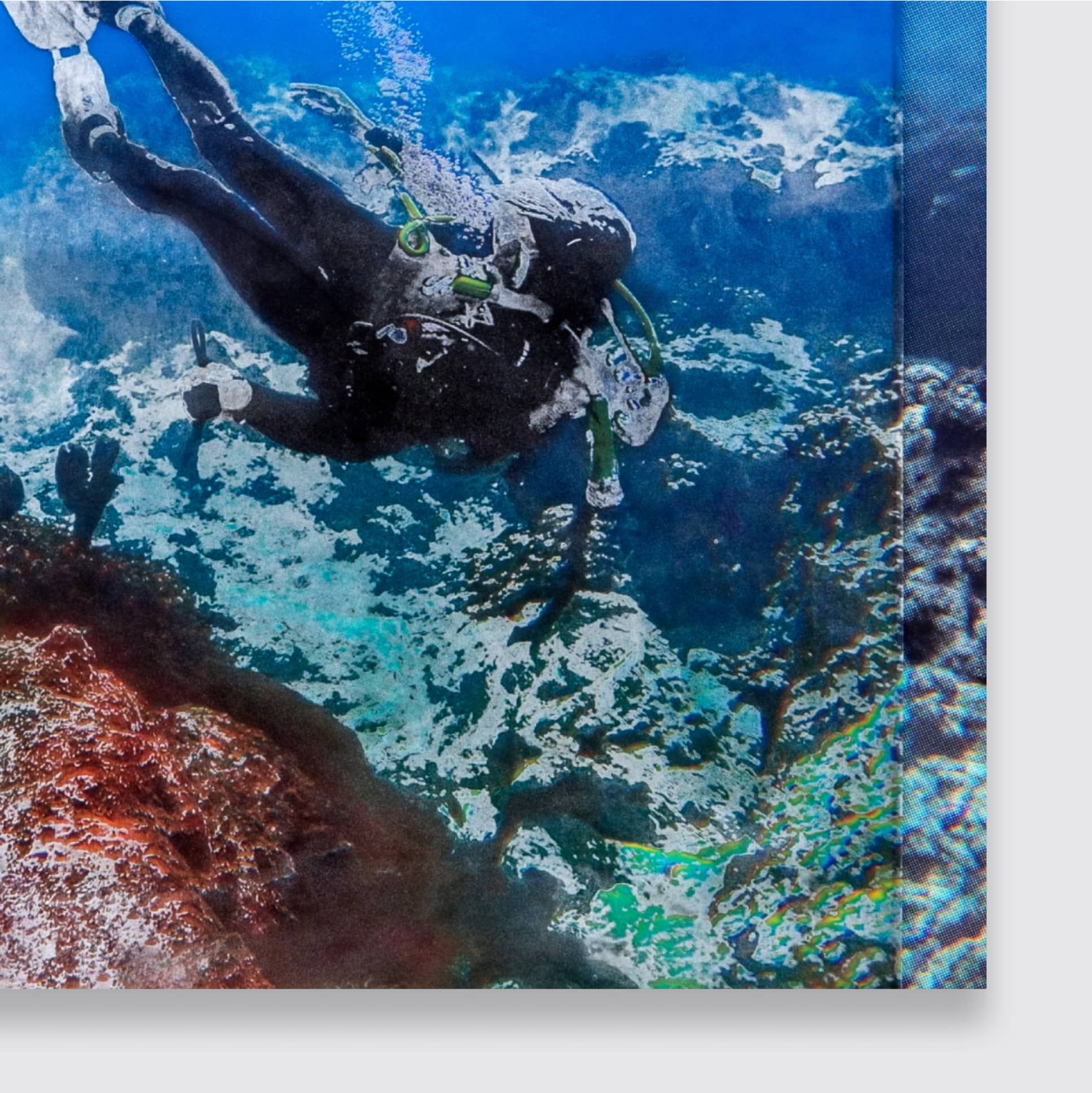 Michael Joo’s print depicts the artist installing a 3D printed sculpture onsite off the coast of Kona, Hawaii, as part of his involvement in making The REEF, an OG:CR physical sculpture with MEGA Lab, a non-profit working on protecting the ocean through art and science. The print itself is a combination of UV printing, screenprinting, and hand-applied layers. Above a silkscreen base layer, which provides added depth, is a top layer of hand-applied silver nitrate on digitally printed vellum. Details of calcium carbonate, the same material used to create his reef sculptures, is painted onto the print, accentuating the whites.